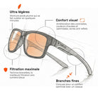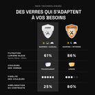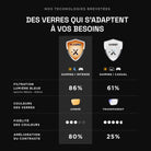 • Blocks 86% of blue light from 380 to 450 nm with amber lenses, or 61% with clear lenses.