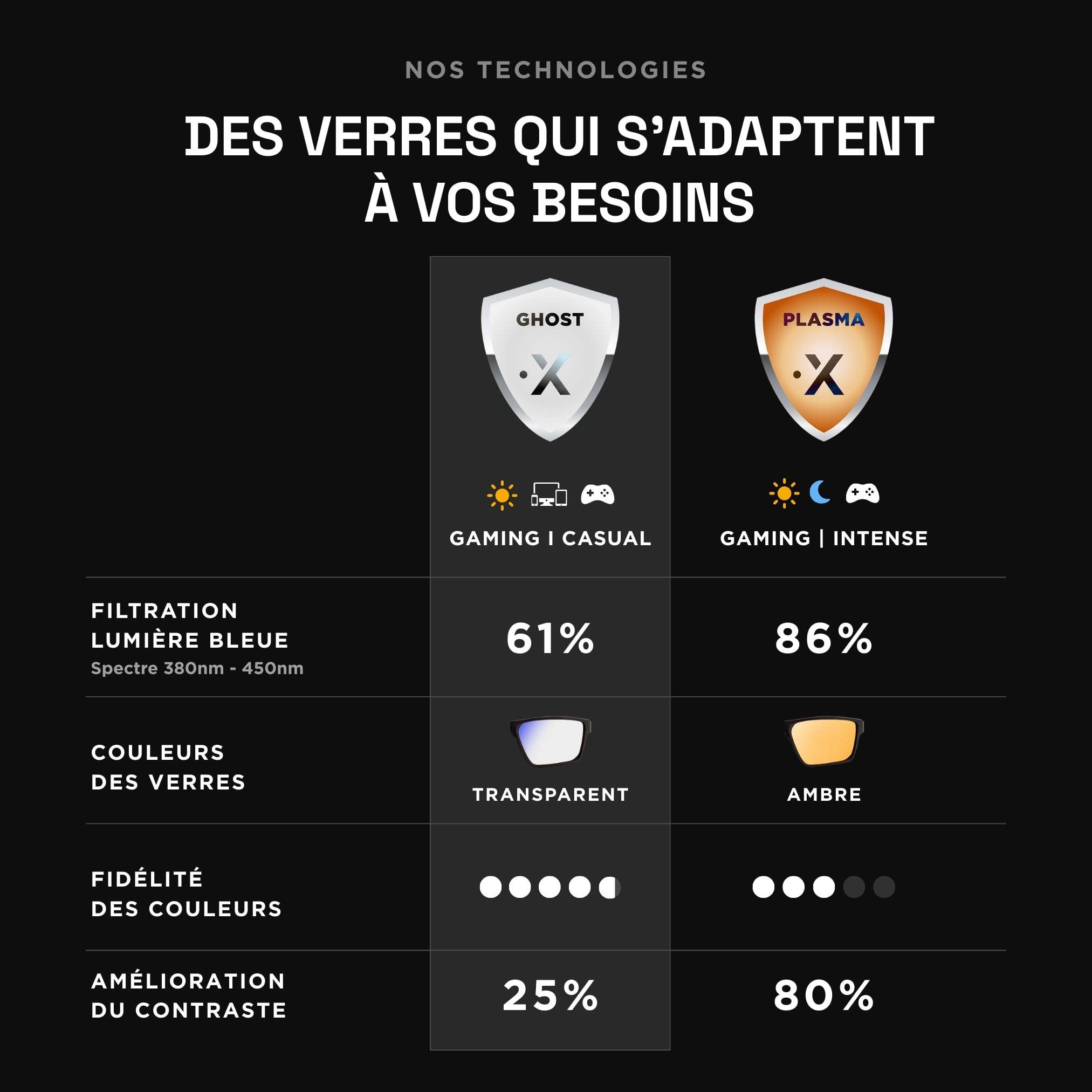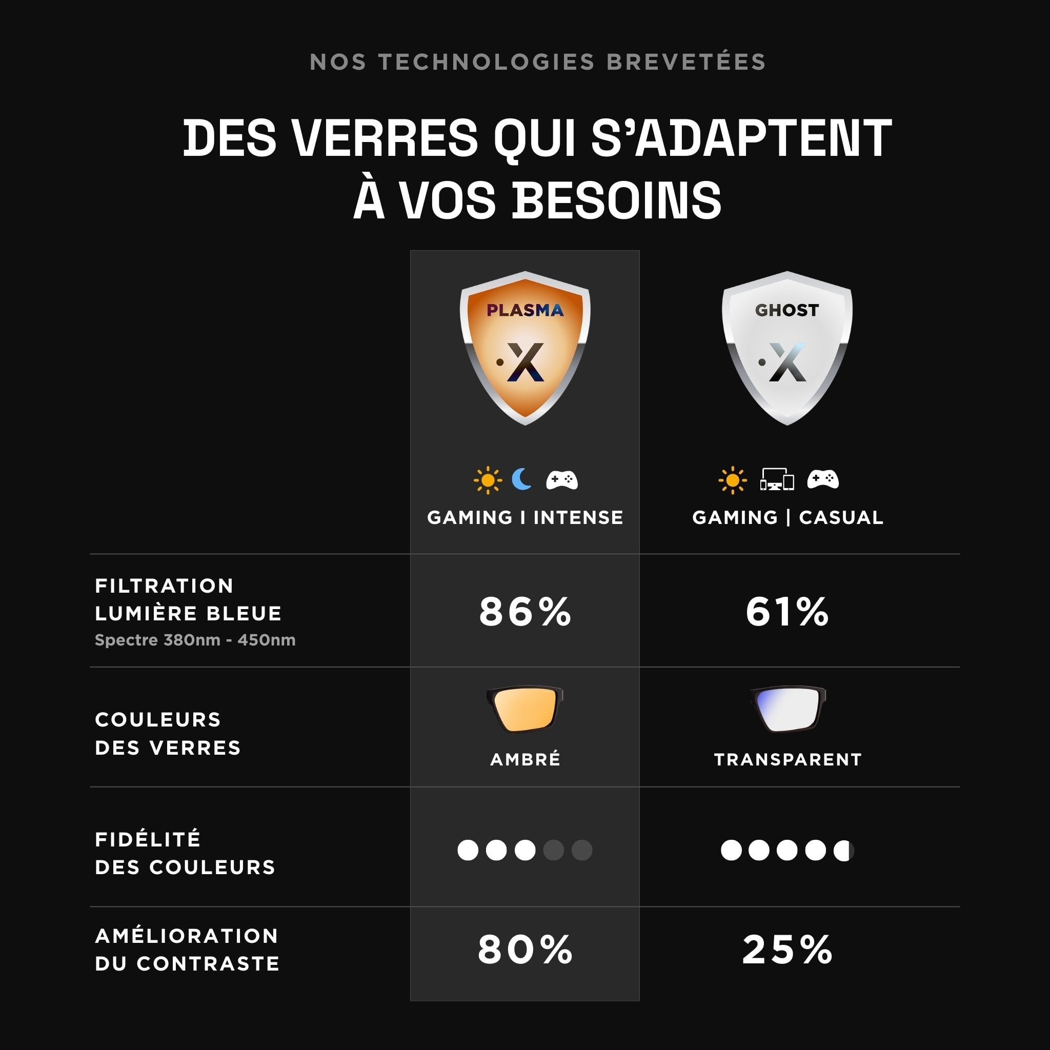 Choose between amber lenses to enhance contrast and block more blue light for those longer gaming sessions, or clear lenses for all-day wear with minimal color distortion for homework or streaming.